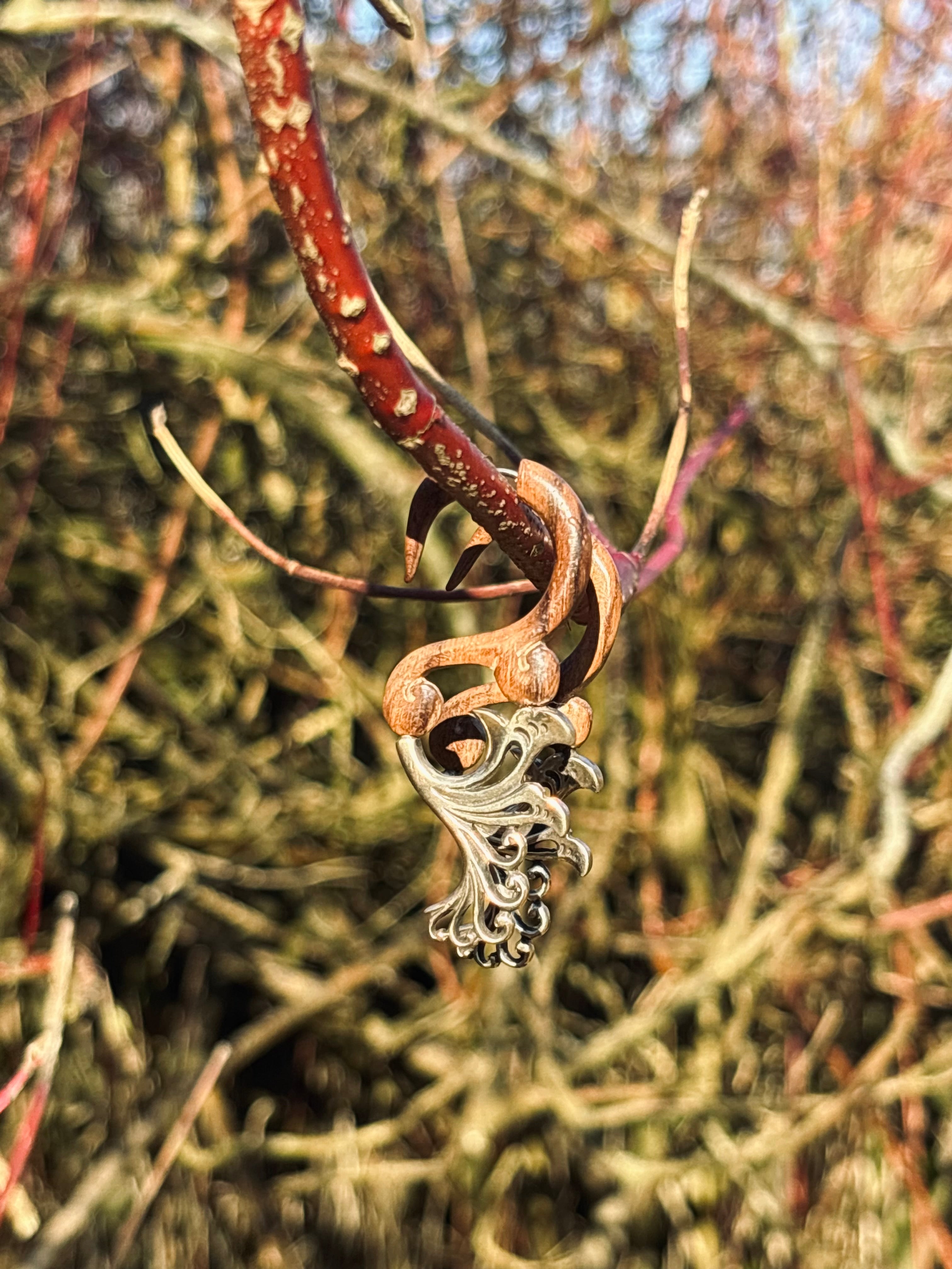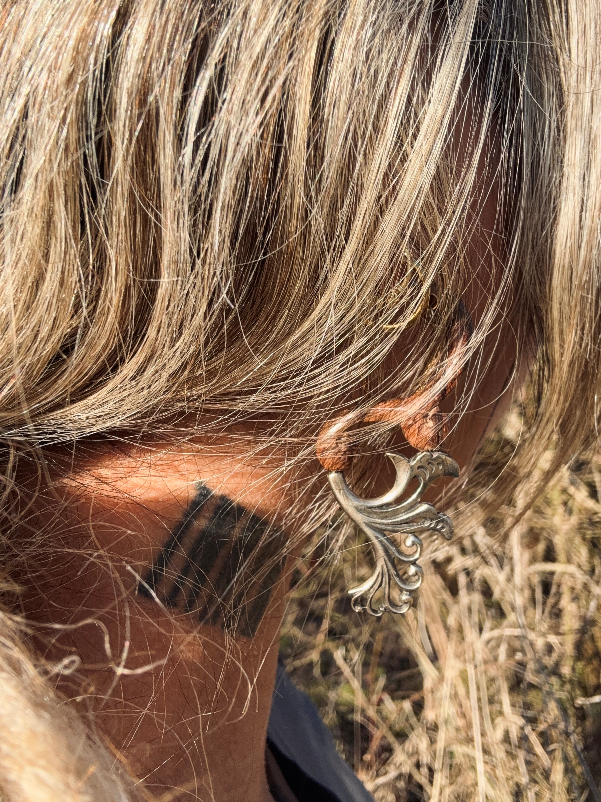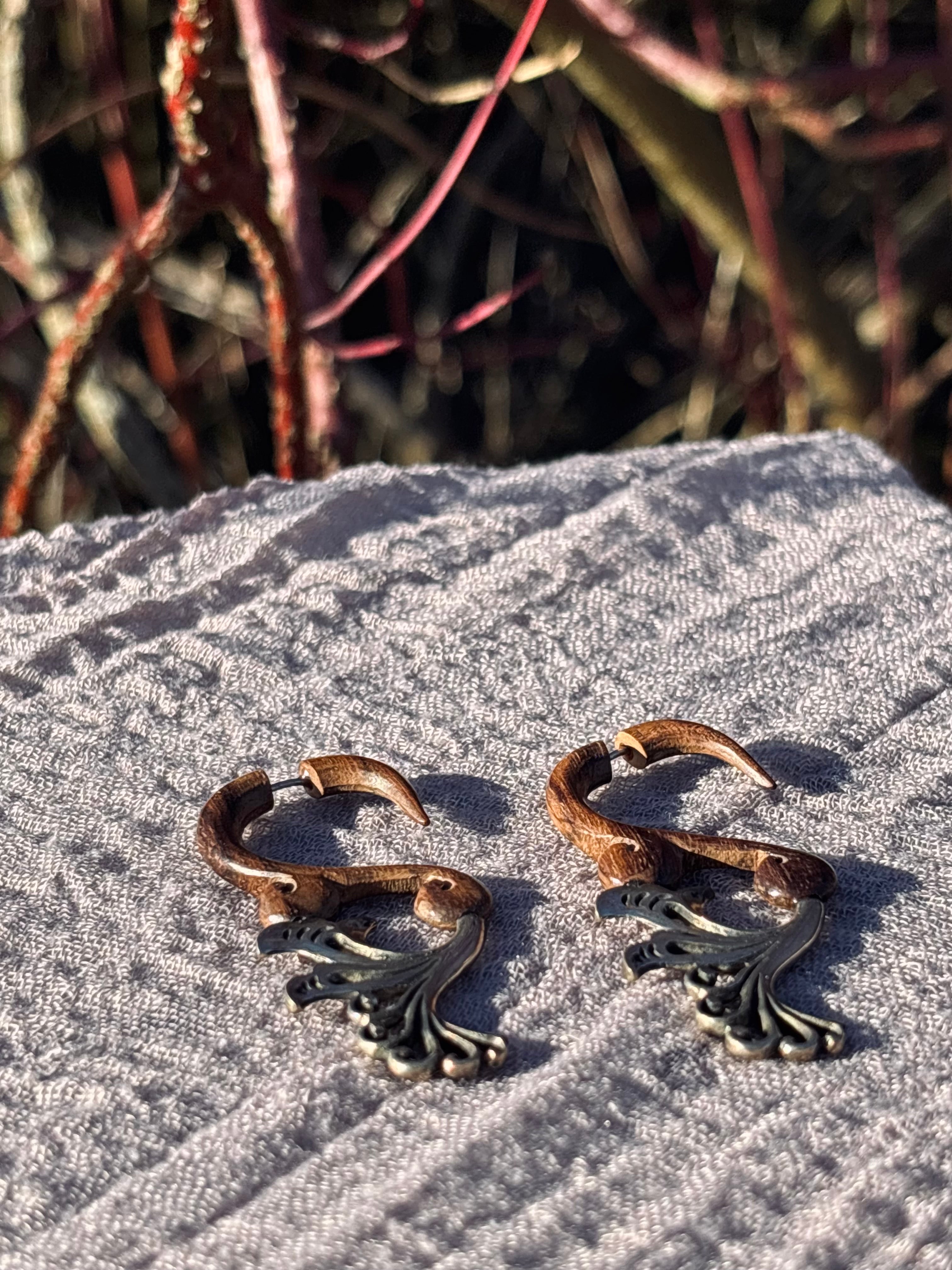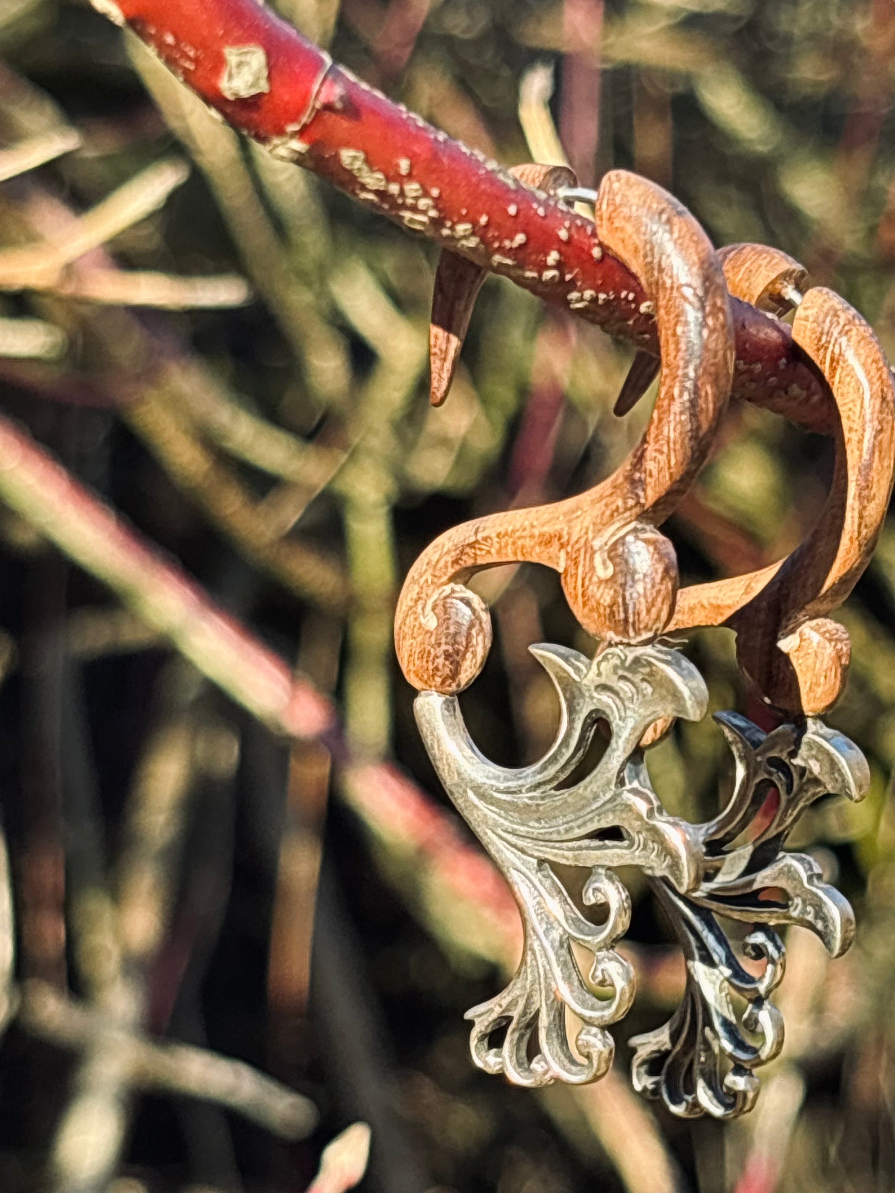 “A celebration of feminine power and untamed grace, the Free Spirit earrings are hand-carved from natural wood and adorned with flowing silver flower details. Their organic curves honor the beauty of freedom, while the delicate floral element brings a soft, sacred feminine touch.